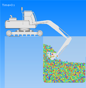 挖掘機是工程建設(shè)與生產(chǎn)中最常見的土方機械,其作業(yè)對象多為土壤、砂石等散體物料,屬于典型的散體系統(tǒng)與多體系統(tǒng)的耦合系統(tǒng),如圖所示。前期,雖然國產(chǎn)挖掘機企業(yè)逐漸加大研發(fā)力度進行產(chǎn)品的性能提升研發(fā)工作,但受限于傳統(tǒng)CAE方法的桎梏,相較于卡特彼勒、小松等國際知名品牌在產(chǎn)品可靠性、作業(yè)效率方面仍然存在一定的差距。目前,國內(nèi)部分知名的挖掘機制造企業(yè)已在利用基于離散元方法工程機械一體化研究思路針對挖掘裝置及整機系統(tǒng)展開了全面研究。