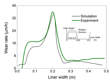 本案例采用DEMSLab軟件和內(nèi)置的侵蝕模型來預測SAG磨機內(nèi)部磨損。根據(jù)相應(yīng)的實驗數(shù)據(jù)定量驗證了標準情況下(轉(zhuǎn)速為10.5 rpm;提升桿面的角度為14°;提升桿高度為152 mm)的仿真結(jié)果。通過對比仿真結(jié)果與實驗基本吻合,表明該方法的準確性可以很好地預測SAG軋機內(nèi)的磨損。然后分別研究了旋轉(zhuǎn)速度、提升條的形狀等因素對磨損的影響,發(fā)現(xiàn)旋轉(zhuǎn)速度對SAG磨機內(nèi)襯板的磨損有重大影響,同時提升條的形狀也會對SAG磨機內(nèi)襯的磨損產(chǎn)生影響,另外轉(zhuǎn)速會影響趾部區(qū)域內(nèi)礦石顆粒的尺寸分布,這對磨損分布也有重要影響。