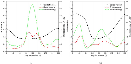 圖 3-13 流化床中時間平均局部固體分數(shù)和累積局部(剪切和法向)沖擊能:
